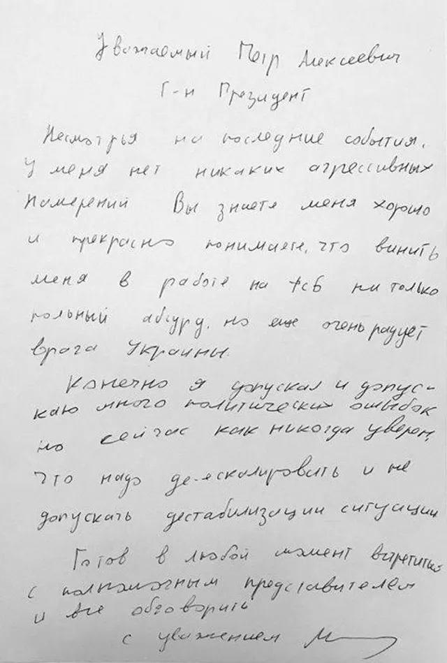 Однако впоследствии, когда фото письма выложил в сеть пресс-секретарь Порошенко Святослав Цеголко, стало понятно: о победителях говорить рано. Ни содержание обращения, ни его тональность не соответствовали тому, о чем говорил Саакашвили. Знаменитое воззвание напоминает скорее прошение о помиловании, чем ультиматум или жесткое требование.