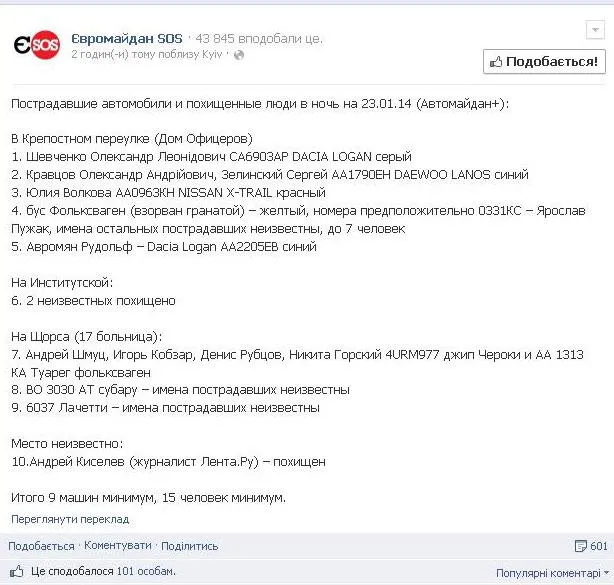Заметим, по информации "Евромайдан SOS", сегодня ночью избит как минимум 9 машин в Крепостном переулке и на улице Щорса. Похищены, как утверждают активисты, около 15-ти человек.