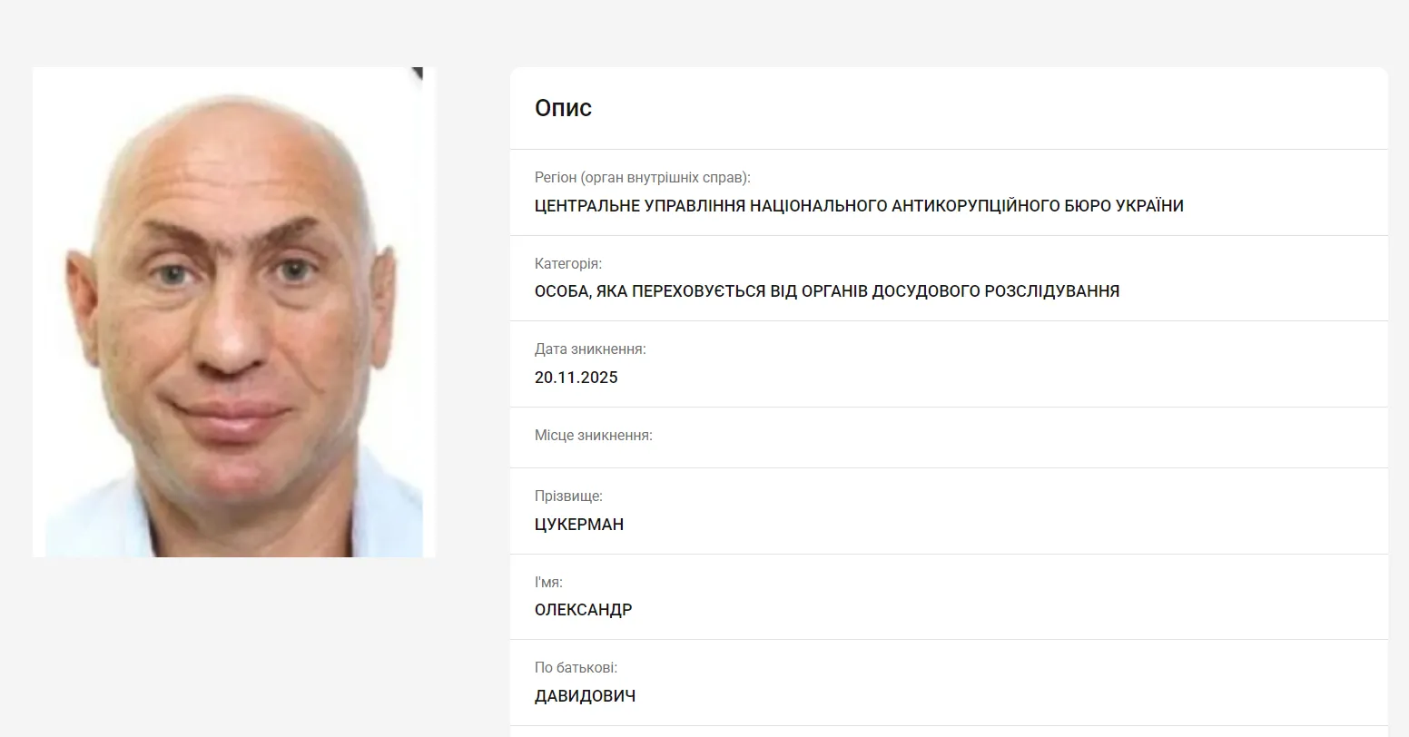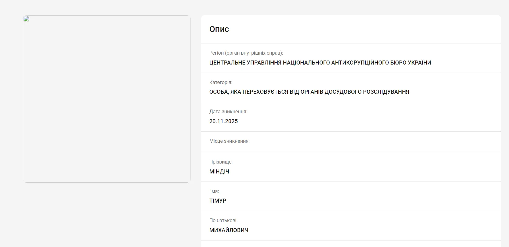 С 22 ноября профили подозреваемых отображаются в разделе "Лицо, которое скрывается от органов досудебного расследования". Даты исчезновения – 20 ноября 2025 года.