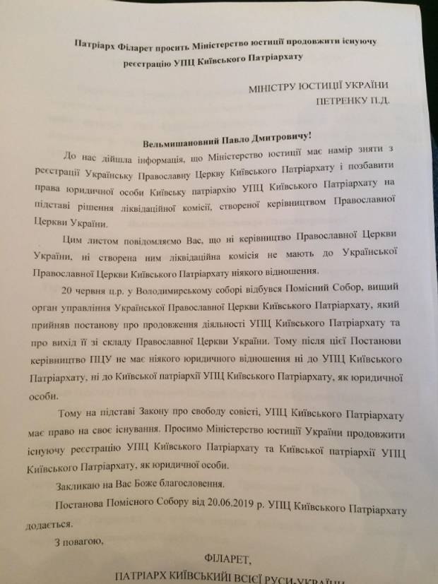 Почетный патриарх обратился с таким же призывом к министру юстиции Павлу Петренко и координатору проекта ОБСЕ в Украине Генрику Вилладсену. Также он написал председателю ПЦУ Епифанию о том, что они не имеют права создавать ликвидационную комиссию УПЦ КП как юридического лица.