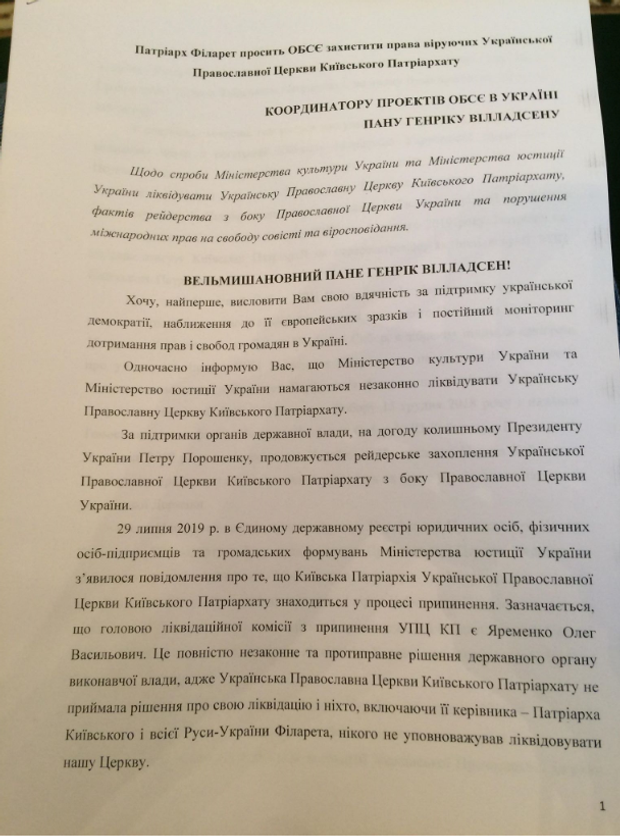 Также патриарх Филарет обратился к ряду структур и лично к президенту Зеленскому с помощью защитить права верующих Украинской церкви.