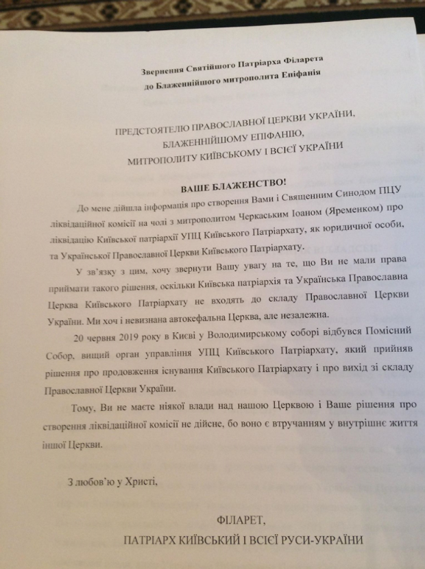 Этим письмом сообщаем Вам, что ни руководство Православной Церкви Украины, ни созданная им ликвидационная комиссия не имеют к Украинской Православной Церкви Киевского Патриархата никакого отношения,