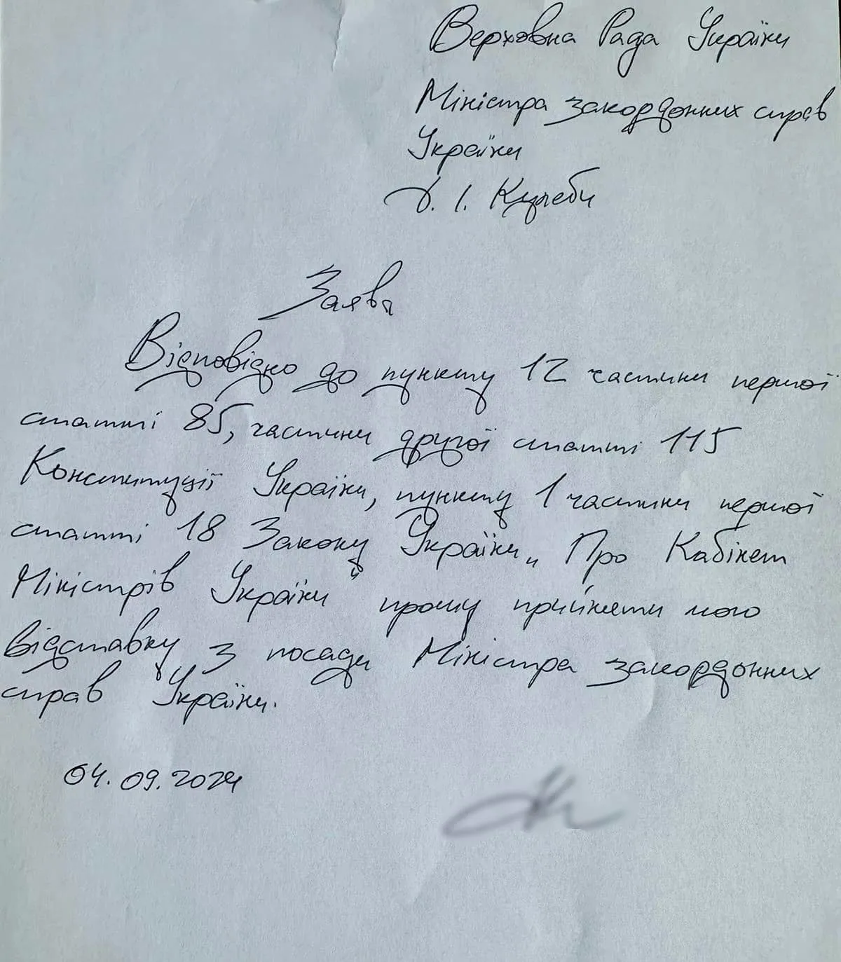 В Верховную Раду поступило заявление от Министра иностранных дел Украины Кулебы Д.И. об отставке,