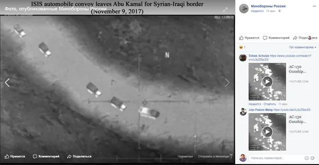 Свои "доказательства" Минобороны России опубликовало в Twitter и Facebook, где указало, что таким образом США продвигают свои американские интересы на Ближнем Востоке. Однако сейчас твит и пост удалены.