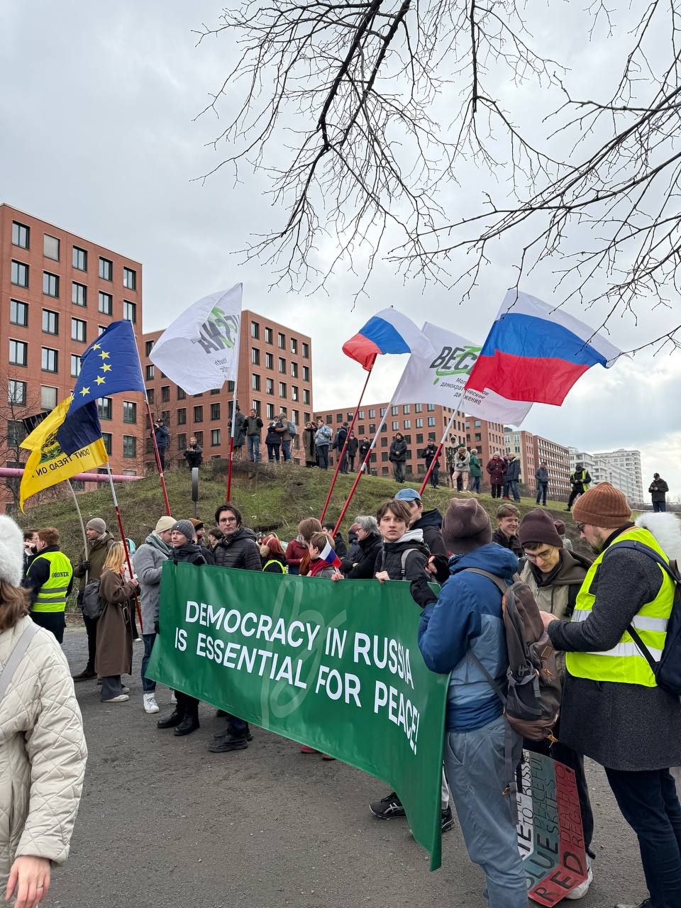 Некоторые участники акции принесли с собой российские, украинские и бело-сине-белые флаги. Также среди них была колонна "Русского Добровольческого Корпуса", представители которого воюют на стороне Украины.
