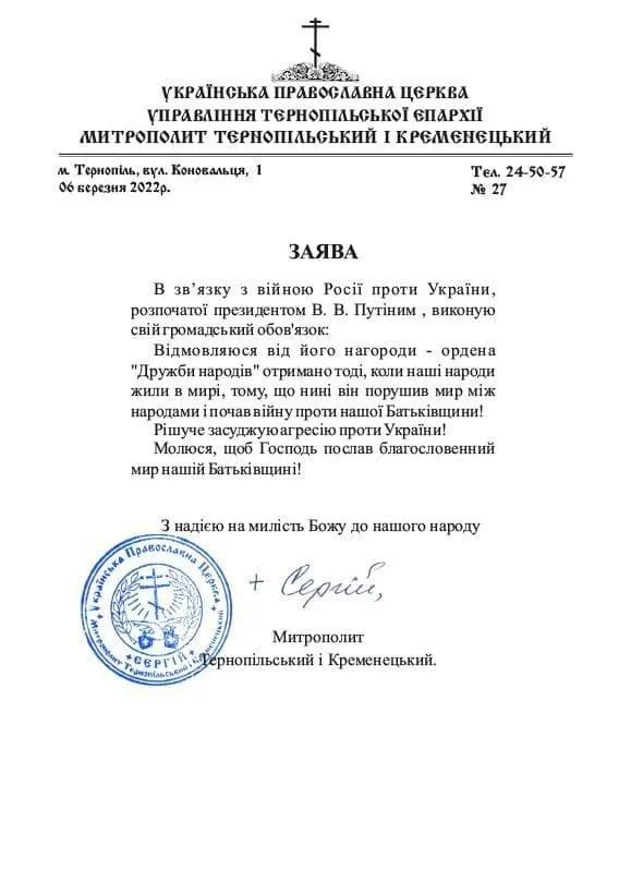 Он написал соответствующее заявление, обнародованное на странице Тернопольской епархии УПЦ МП. Митрополит решил отречься от государственного ордена страны-агрессора.