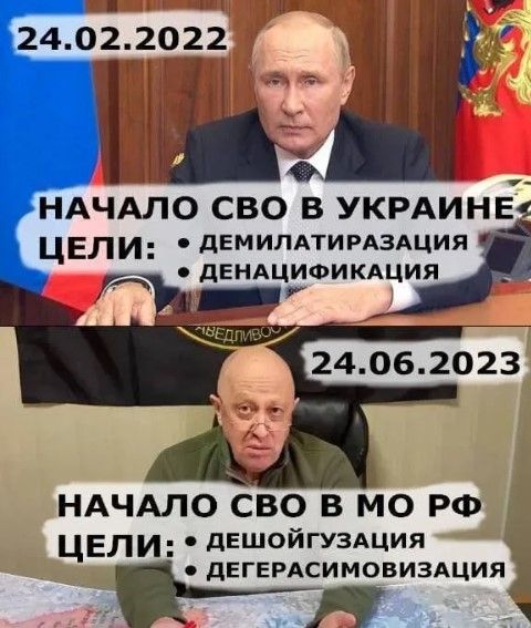 И хотя мятеж не завершился так, как того ожидали украинцы, такое внезапное смирение предводителя ЧВК "Вагнера" вызвало лишь новую волну мемчиков в сети. Прежде всего, касаемо военных побед как самого Пригожина, который остановился в двух шагах от Москвы, так и его боевиков.