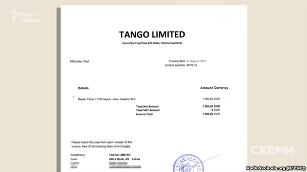 В счете за перелет, который Виталий Кличко отправил журналистам, указано, что мэр Киева должен оплатить 1500 евро без НДС на счет компании Tango limeted, зарегистрированной на Сейшельских островах.