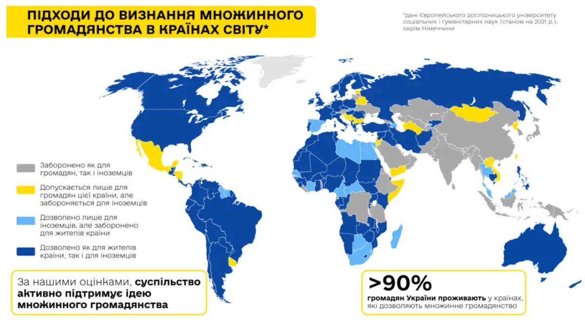 При этом 90% украинцев за рубежом сейчас находятся в странах, где разрешено множественное гражданство.