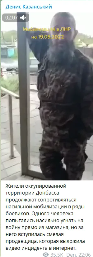 Украинский блоггер Денис Казанский в своем телеграм-канале опубликовал сообщение, где мужчину пытались насильственно мобилизовать на временно оккупированной территории Донбасса. Однако продавщица местного магазина смогла спасти его.