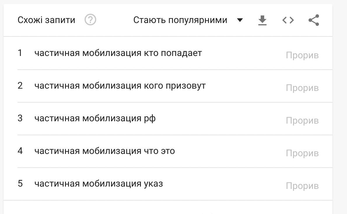 Кроме этого, россияне начали массово гуглить что такое частичная мобилизация, кого призовут в армию и подробнее об этом указе в целом.