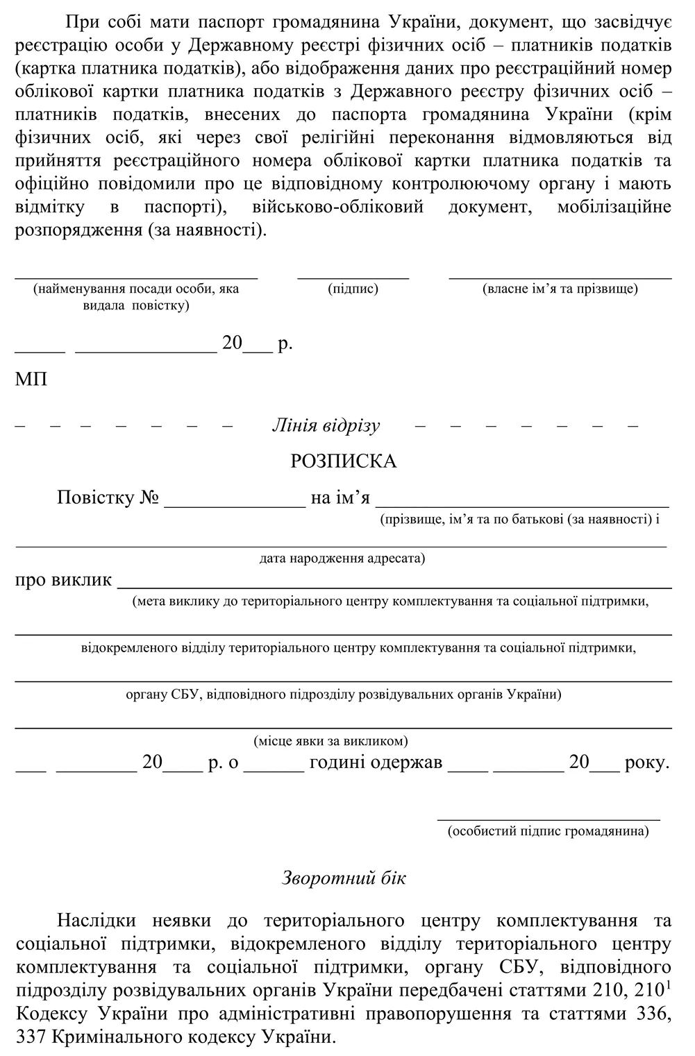 Постановление предусматривает, что повестки, сформированные с помощью Единого государственного реестра призывников, военнообязанных и резервистов (в частности, распечатанные), и повестки, оформлены на бланке, будут иметь одинаковую юридическую силу. Руководитель ТЦК должен засвидетельствовать повестку личной подписью и скрепить гербовой печатью.