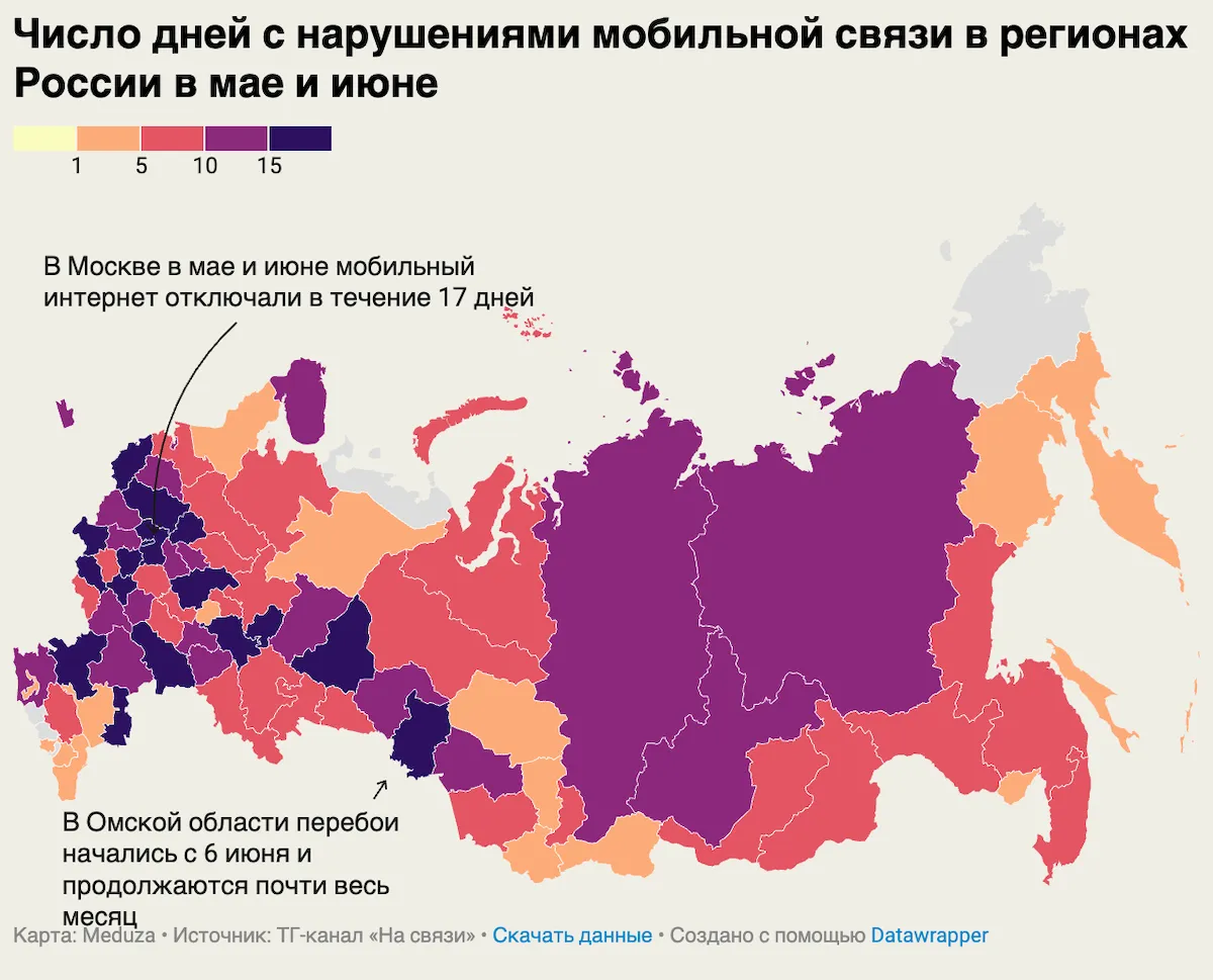 Примером радикального эксперимента стала Нижегородская область. Meduza описывает случай, когда в некоторых селах мобильный интернет отсутствует уже более двух месяцев, а в отдельных городках прекращена даже голосовая связь (звонки через мобильную сеть не проходят).