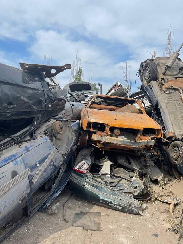 Недавно российские захватчики оборудовали новое "кладбище" автомобилей, уничтоженных от боевых действий. Остатки машин они разместили на штрафплощадке на Никольском проспекте Ильичевского района.