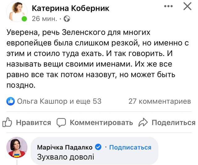 Разделяет позицию в речи Зеленского и нардеп Ирина Геращенко. Несмотря на частую и резкую критику в адрес украинского лидера, она назвала выступление президента правильным по акцентам и содержанию.