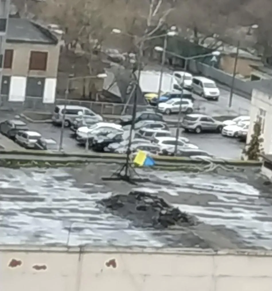 Очевидцы рассказали, что символ украинского государства появился на крыше админздания еще 9 апреля. Украинское знамя пробыло на крыше все утро.