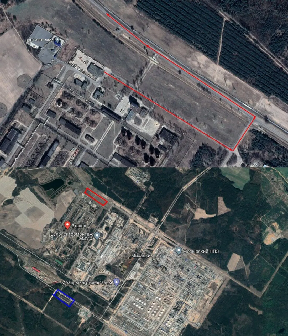 В белорусских телеграм-каналах пишут, что на Мозырском спирто-водочном заводе "Этанол" может располагаться база войск России. Сам завод размещен рядом с Мозырским нефтеперерабатывающим заводом. Расстояние от него до украинской границы составляет 30 километров.