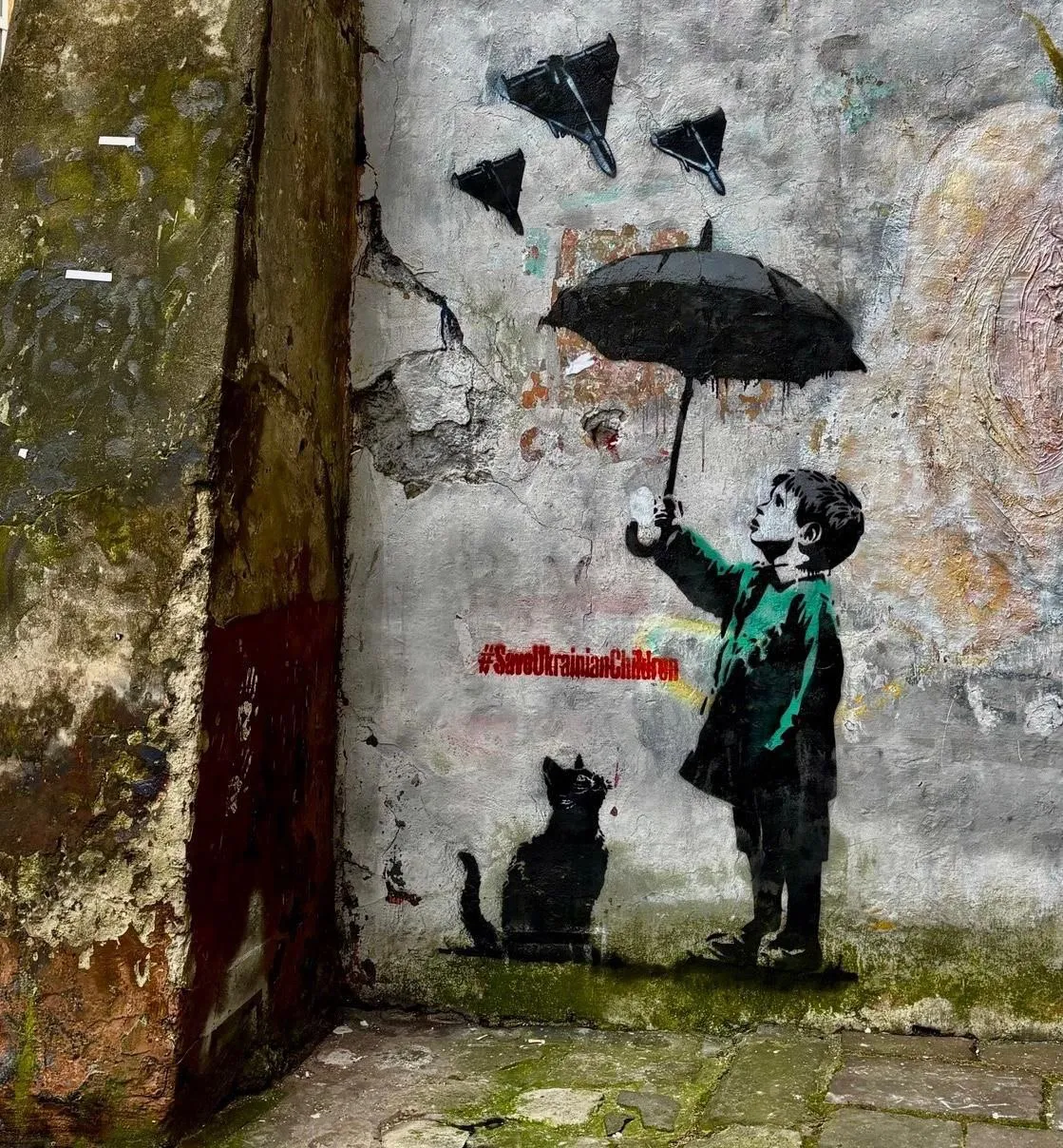 Андрей Ермоленко, который работает в похожем стиле рисования, как у английского стрит-художника Бэнкси, изобразил на стене ребенка, который держит зонтик над котиком, прикрывая его от российских "Шахедов".