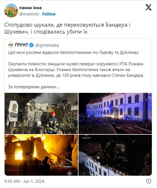 Ведущий 24 Канала Андрей Дрозда также прокомментировал циничную атаку и отметил, что музей и университет, в котором когда-то учился Бандера, россияне считают для себя "не менее опасными, чем аэродромы или милитарные заводы".