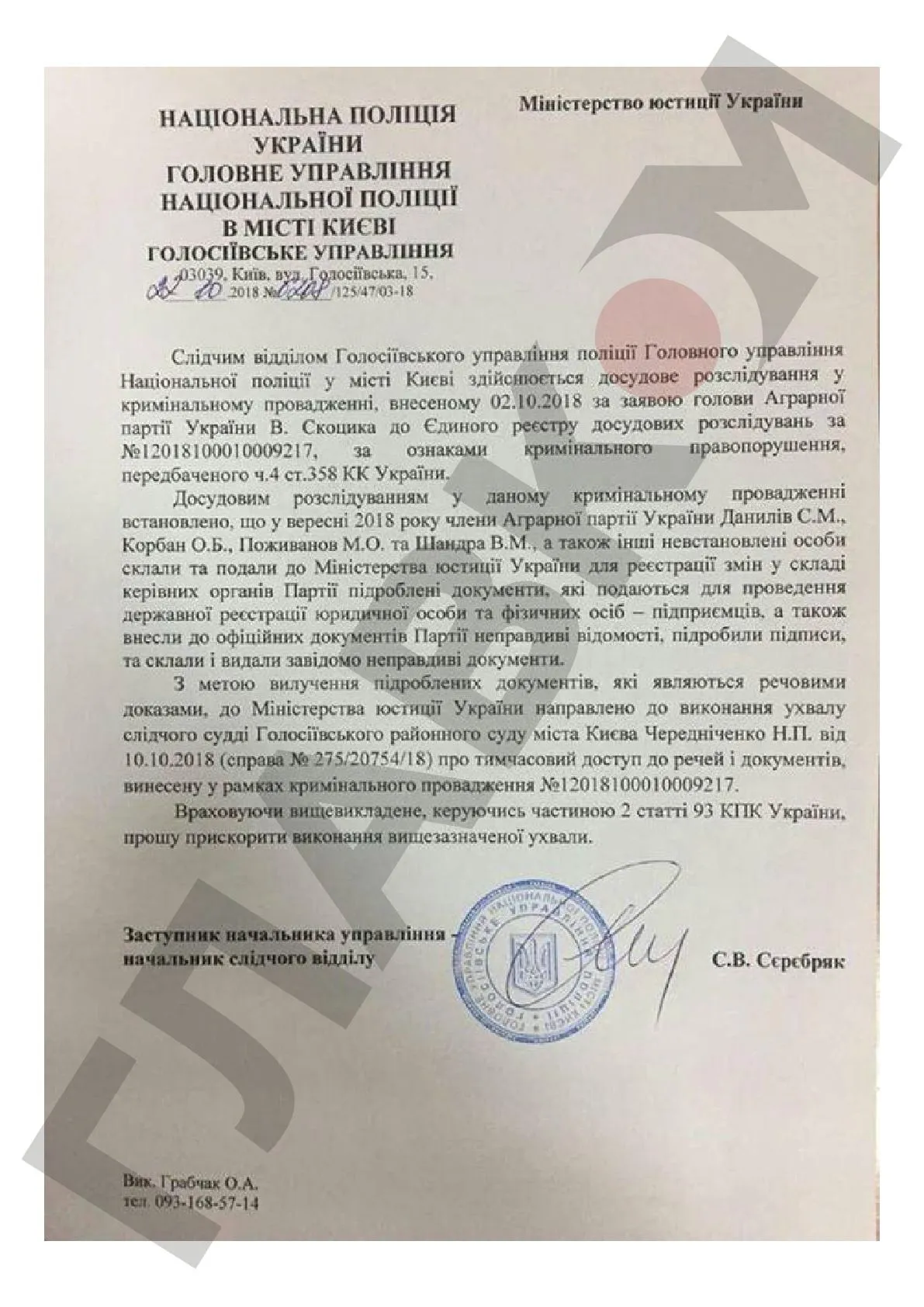 "Досудебным расследованием в уголовном производстве установлено, что в сентябре 2018 года члены Аграрной партии Данилов, Корбан, Поживанов и Шандра, а также другие неустановленные лица составили и подали в Министерство юстиции Украины для регистрации изменений в составе руководящих органов партии поддельные документы, которые обычно подают для государственной регистрации юридического лица и физических лиц-предпринимателей, а также внесли в официальные документы Партии ложные сведения, подделали подписи и составили и выдали заведомо ложные документы", – сказано в постановлении.