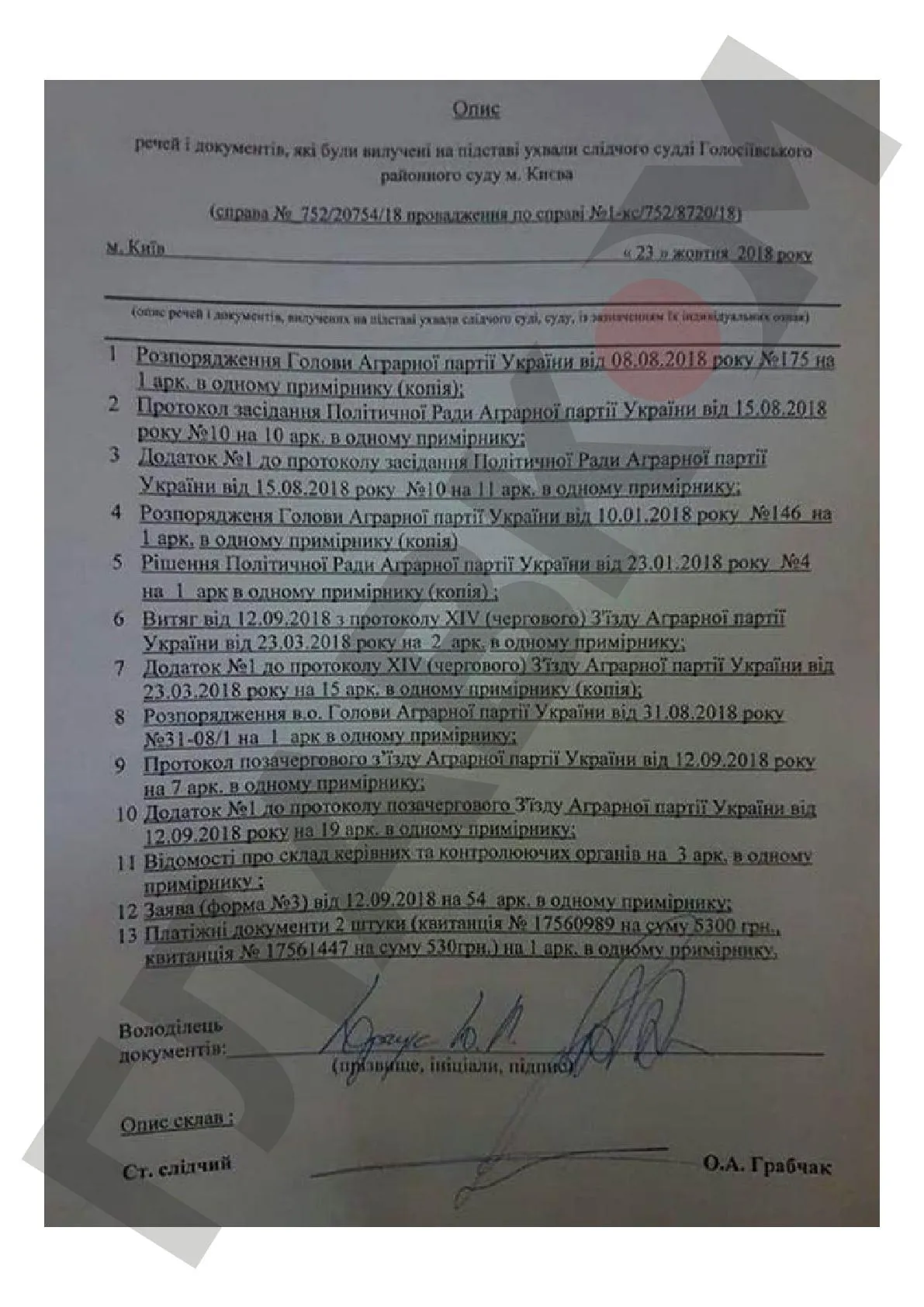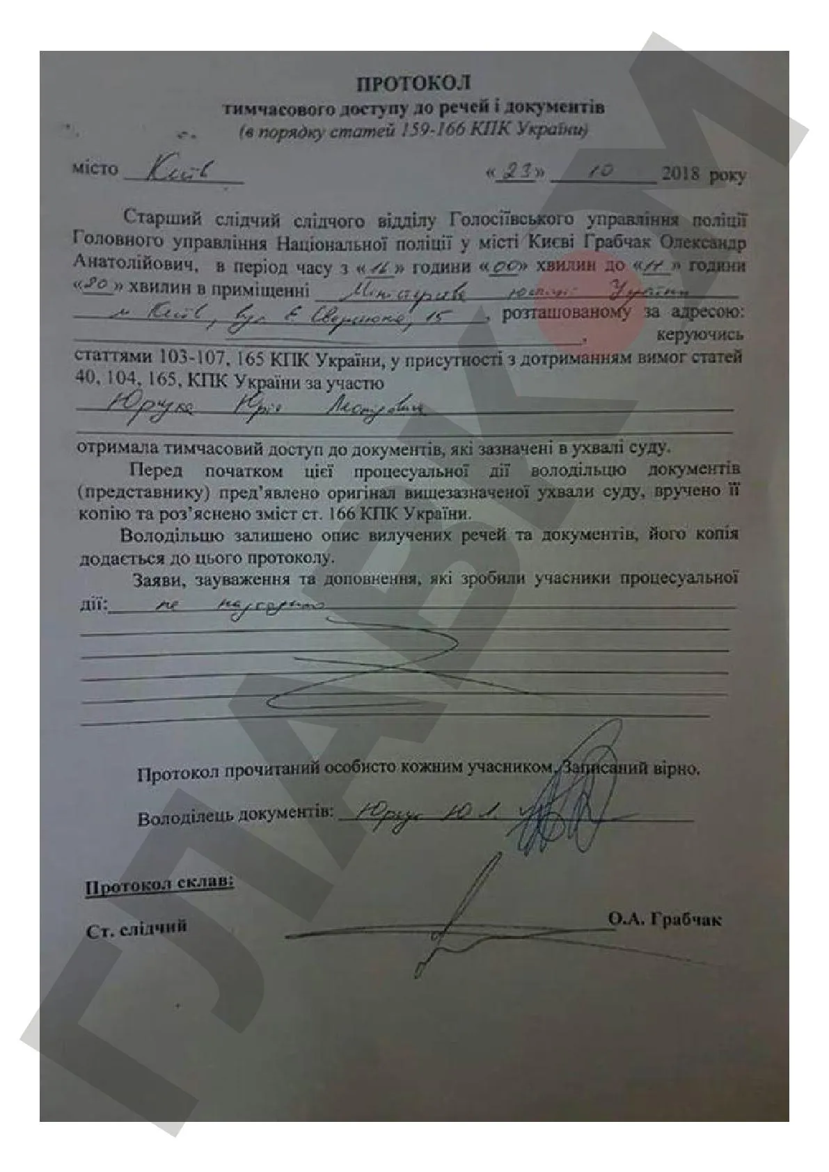 В распоряжение "Главкома" попало постановление об изъятии документов следственного судьи Голосеевского районного суда города Киева Н.П. Чередниченко.