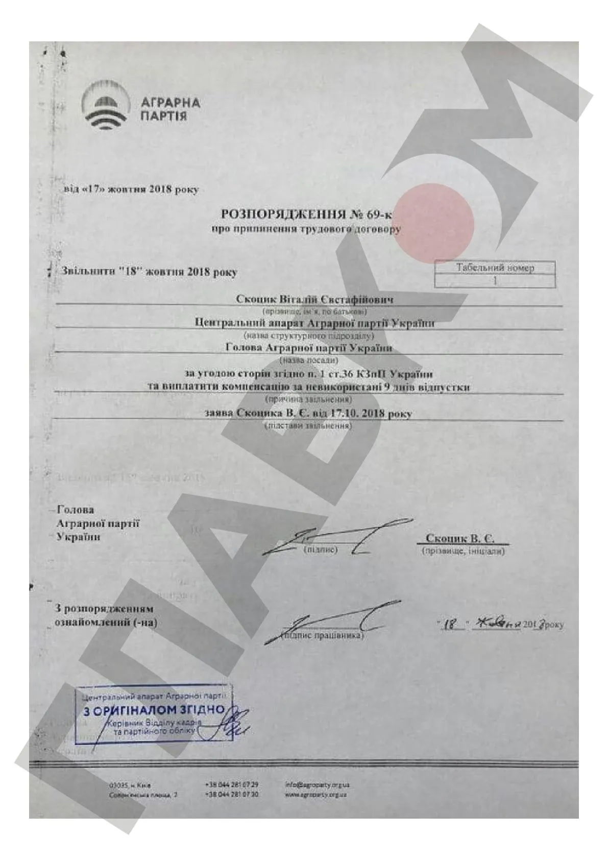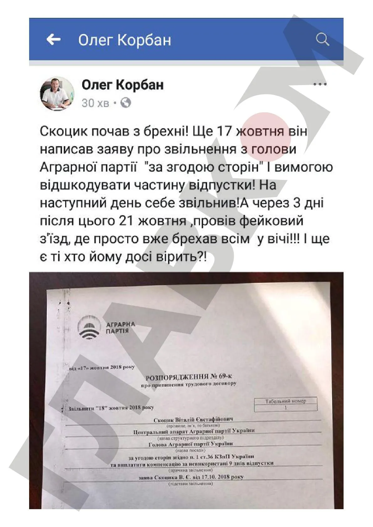 "Несмотря на то, что идет уголовное производство по фальсификации официальных документов партии, рейдеры продолжают подделывать документы и нагло, публично этим кичатся. Вчера Олег Корбан выставил в Facebook пост с якобы распоряжением об увольнении Виталия Скоцика с должности председателя Аграрной партии еще 17 октября и невозможность проведения Съезда 21 октября. Такого уровня кощунства и таких технологий очернения трудно и представить. Однако этот циничный поступок свидетельствует лишь о том, что политические рейдеры не уверены в собственной победе, и именно поэтому продолжают фальсифицировать документы. Мы очень надеемся, что правоохранительные органы будут действовать по закону и преступникам не удастся избежать наказания", - комментируют события в окружении лидера Аграрной партии Виталия Скоцика.