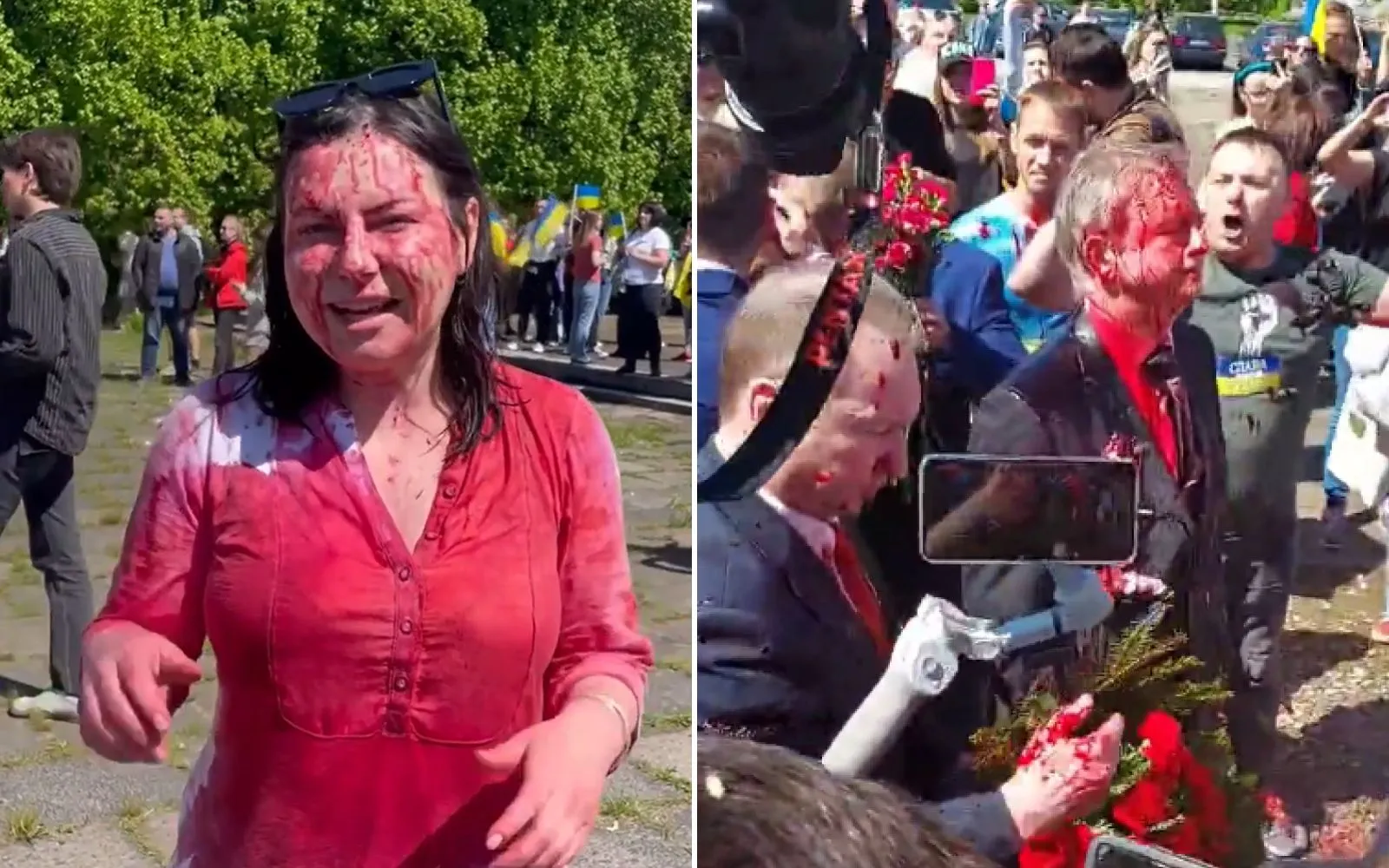 Но, по словам Ирины Земляной, почему-то полиция позволила вплотную подойти к российскому послу, и активисты облили себя красной краской (это был свекольный сок) и случайно и посла, потому что он стоял слишком близко.