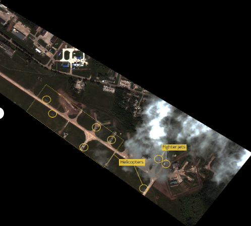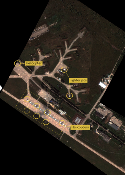 На спутниковых снимках за 22 июля видно, что на аэродроме размещены только два вертолета и пять истребителей. А уже 14 августа можно увидеть 14 вертолетов и 4 истребителя.