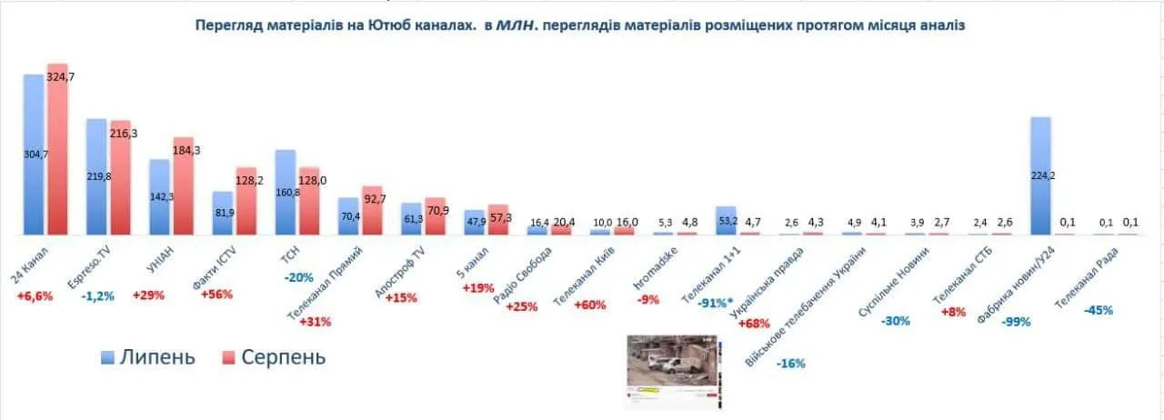 Согласно новому исследованию, в течение августа 2022 видео на ютубе 24 канала просмотрели уже 324,7 миллиона раз по сравнению с 304,7 миллионами в июле.