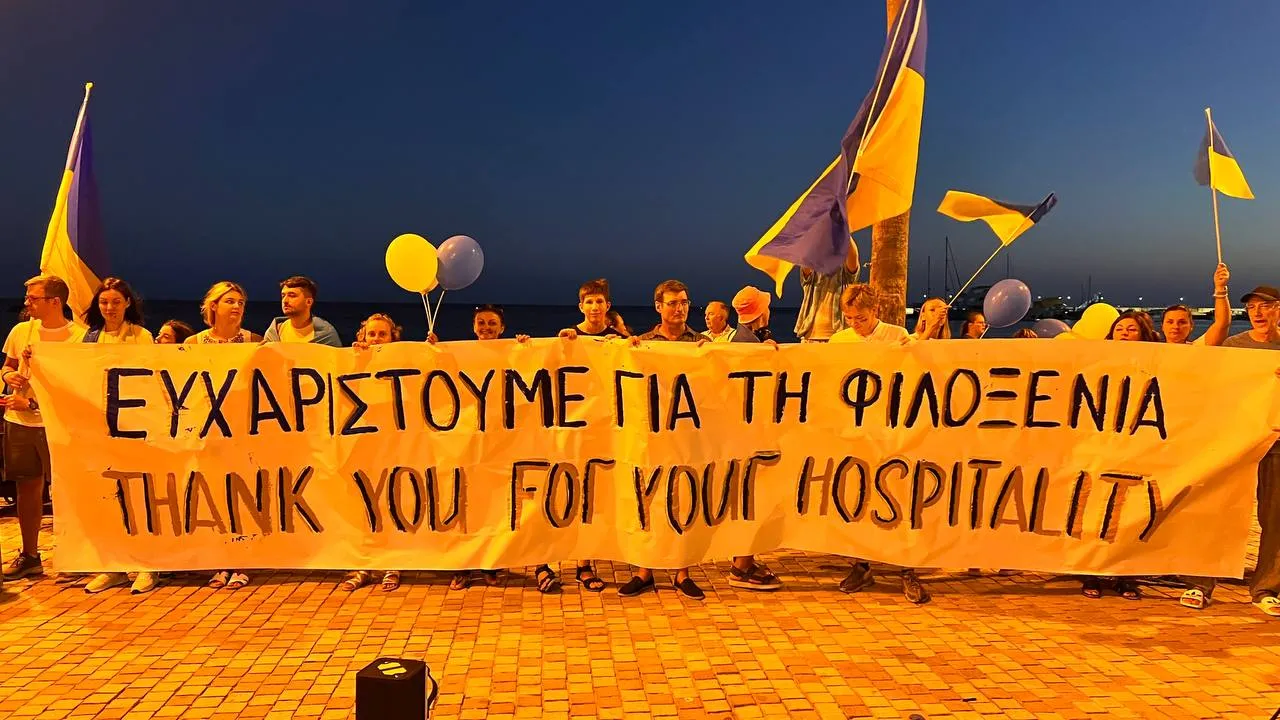Граждане Украины нарисовали 10 метровый баннер со словами благодарности на греческом и английском. Так они поблагодарили жителей Кипра за поддержку и гостеприимство.