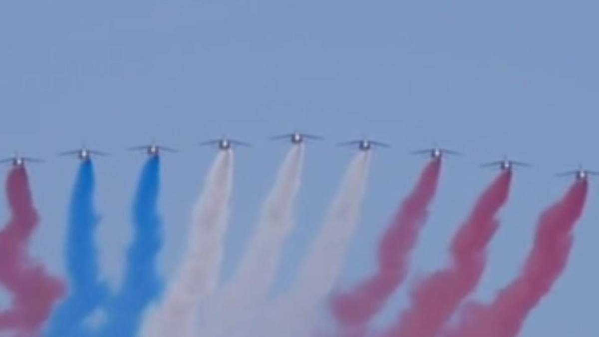 Девять самолетов выпускали полосы дыма в порядке расположения цветов французского флага – синего, белого и красного. Однако пилот, который должен был выпускать синюю полосу флага, выпустил красный дымовой след.