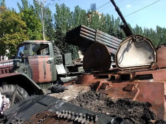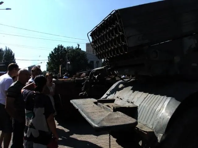 Сегодня террористы выставили на показ поврежденную военную технику, которая по словам боевиков, была отбита у украинской армии.