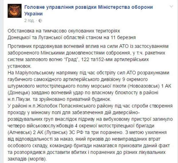 Известно, что в результате этого погибли сразу четверо боевиков, воевавших в рядах так называемой мотострелковой бригады (Алчевск) 2 АК (Луганск).