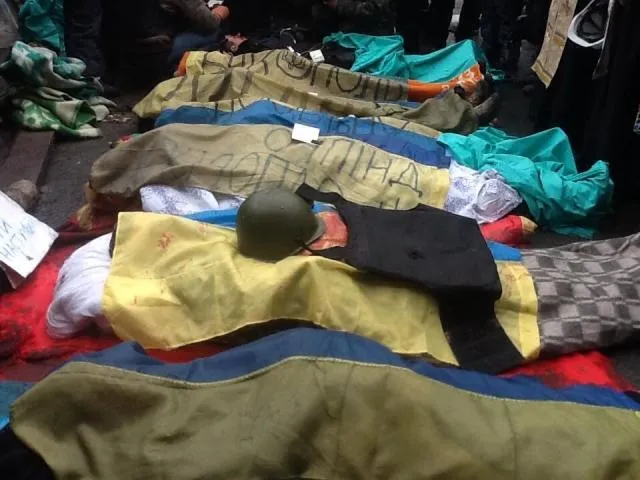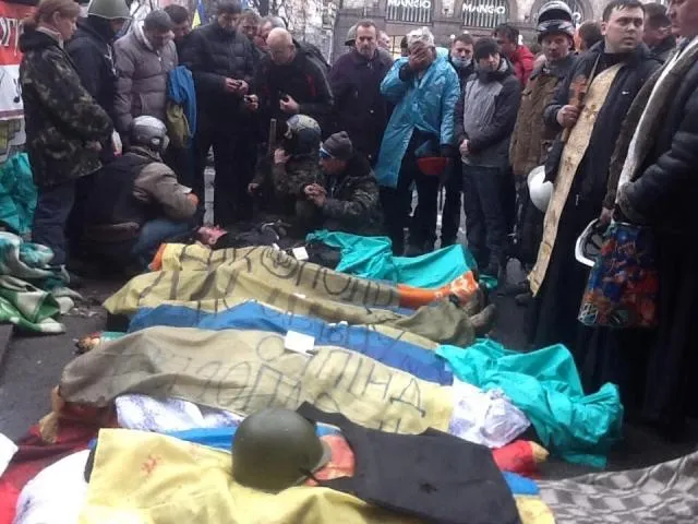 По информации корреспондента агентства "Интерфакс-Украина", на Майдане Независимости в районе отеля "Казацкий" на земле лежат 7 тел погибших.