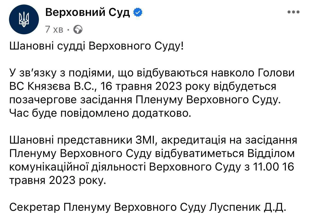 В Верховном Суде отреагировали на ситуацию. На официальной странице в фейсбуке написали, что 16 мая состоится внеочередное заседание Пленума Верховного Суда. Связано оно с "происходящими вокруг главы ВС событиями". Фактически этим сообщением подтвердили, что подозревают во взятке именно Князева.