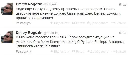 "В Мюнхене госсекретарь США Керри обсудит ситуацию в Украине с боксером Кличко и певицей Русланой. Цирк. А нацика Тягнибока чего не взяли? Надо еще Верку-Сердючку привлечь к переговорам. Ее/его авторитетное мнение должно быть услышано Белым домом и принято во внимание!"- Пишет он