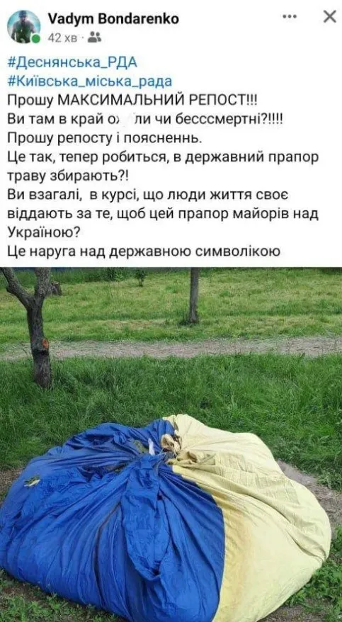 В Киеве коммунальный работник использовал государственный символ страны в хозяйственных целях. Работник из Деснянского района столицы положил во флаг скошенную траву, что вызвало возмущение пользователей соцсетей. Об инциденте сообщил на своей странице в фейсбуке киевлянин Вадим Бондаренко.