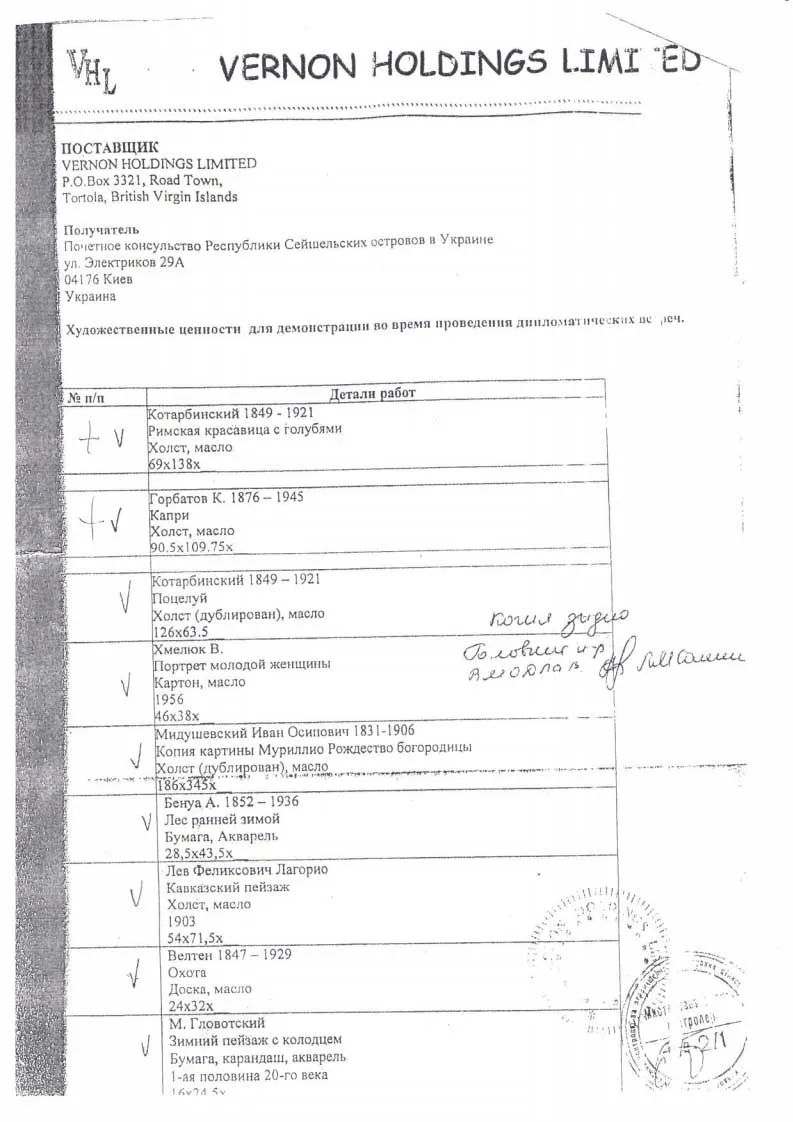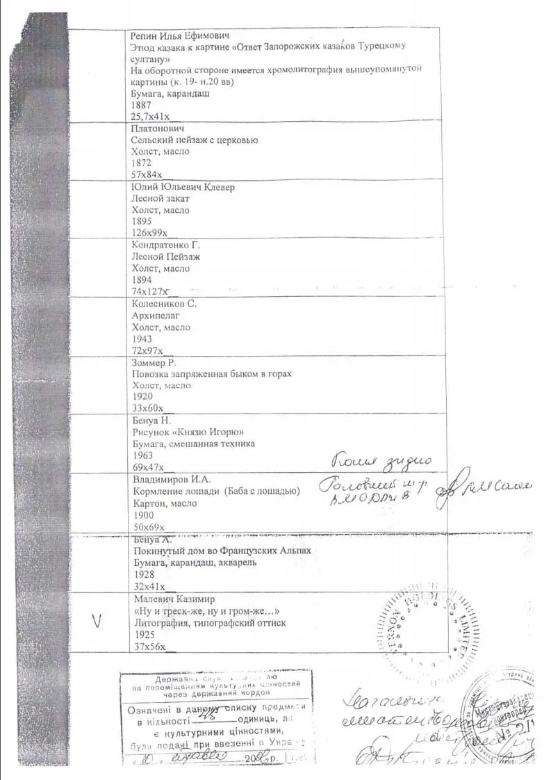 Речь идет о 45 работах, среди которых произведения Казимира Малевича, Ильи Репина, Константина Коровина, Ивана Айвазовского, Исаака Левитана. Работы попали в Украину в рамках режима временного ввоза "для демонстрации во время проведения дипломатических встреч", как говорится в брокерских документах. Однако, уполномоченной комиссией было установлено, что картины разошлись по частным коллекциям, а часть из них просто исчезла.