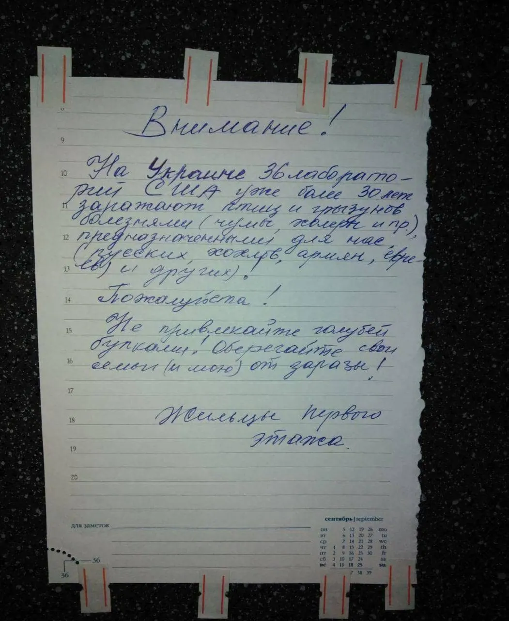 Внимание! В Украине 36 лабораторий США уже 20 лет инфицируют птиц и грызунов болезнями (чумой, холерой и т.д.), предназначенных для нас (русских, хохлов, армян, евреев и других). Пожалуста! Не привлекайте голубей булками! Оберегайте свои семьи (и мою) от заразы,