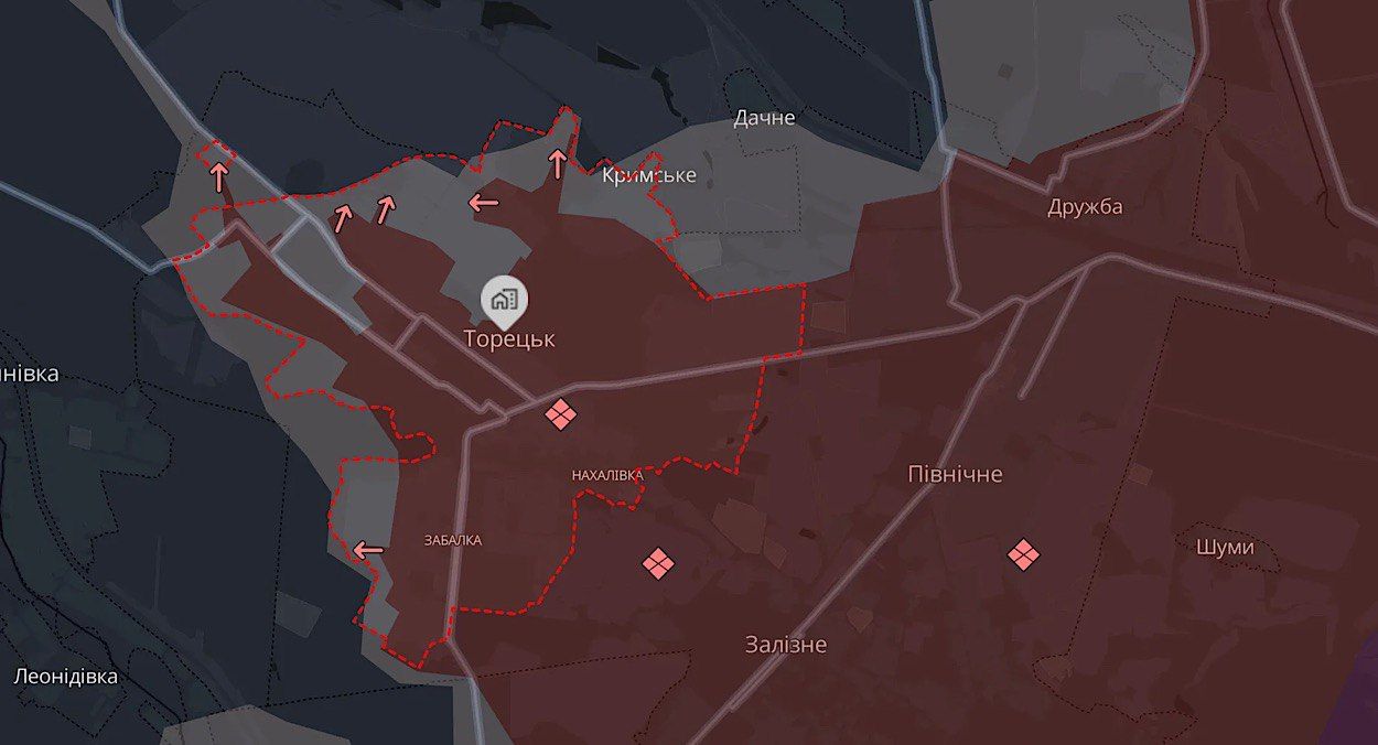 По данным аналитиков, по состоянию на 23 апреля враг продвинулся в районах Тарасовки, Нелиповки и в самом Торецке.