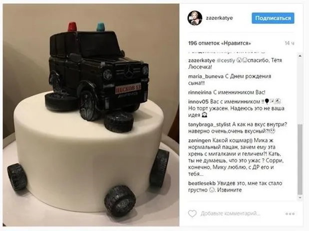 Последний раз бывшая жена пресс-секретаря Путина попала в светские хроники, подарив на 13-летие сыну Мику торт с "Гелендвагеном".