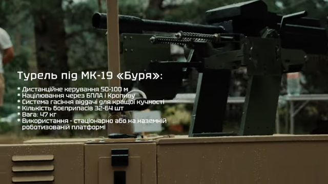 Роботизированная турель "Буря" под 40-миллиметровый гранатомет Mk 19 и многофункциональный НРК "Термит" завершили интеграцию в единую боевую систему. Этот новый продукт позволит военнослужащим ВСУ вести огонь из гранатомета Mk 19 на расстоянии, не подвергая себя опасности. Шасси "Термит" имеет запас хода 20 километров, обеспечивая стабильную связь и возможность маневрирования даже в сложных условиях. Гранатометная турель "Буря" позволяет проводить пристрелку в 10 раз эффективнее и работать по разным целям, осуществляя перенацеливание за считаные секунды по команде оператора,