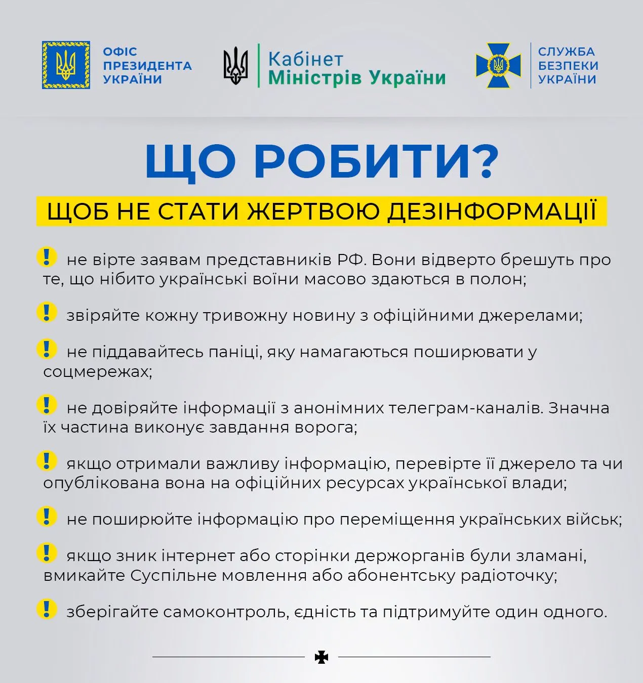Прежде всего всех граждан страны просят узнавать информацию только из надежных источников. При получении тревожной новости, необходимо сразу проверить, были ли соответствующие публикации на страницах госструктур и служб Украины.
