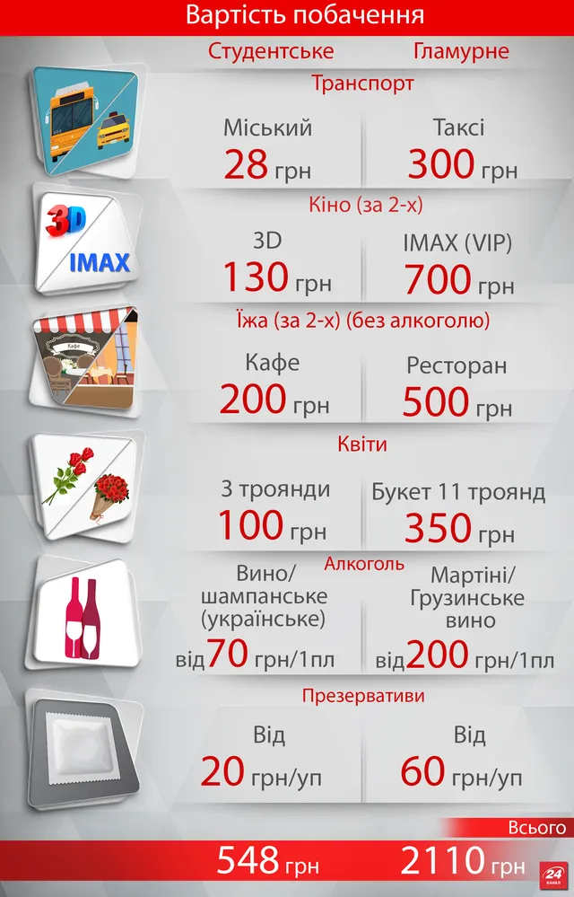 "Гламурный" кавалер поведет избранницу, конечно, в ресторан. Где примерно такой же набор блюд, как и в "студенческом" случае, обойдется вдвое дороже плюс чаевые официанту — всего около 500 гривен.