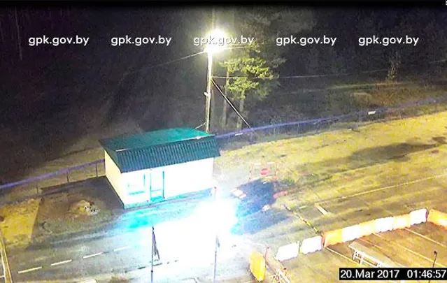 Автомобиль разбил шлагбаум на белорусской стороне, проехал через средство принудительной остановки и пытался прорваться дальше. Это зафиксировала камера видеонаблюдения в пункте пропуска.