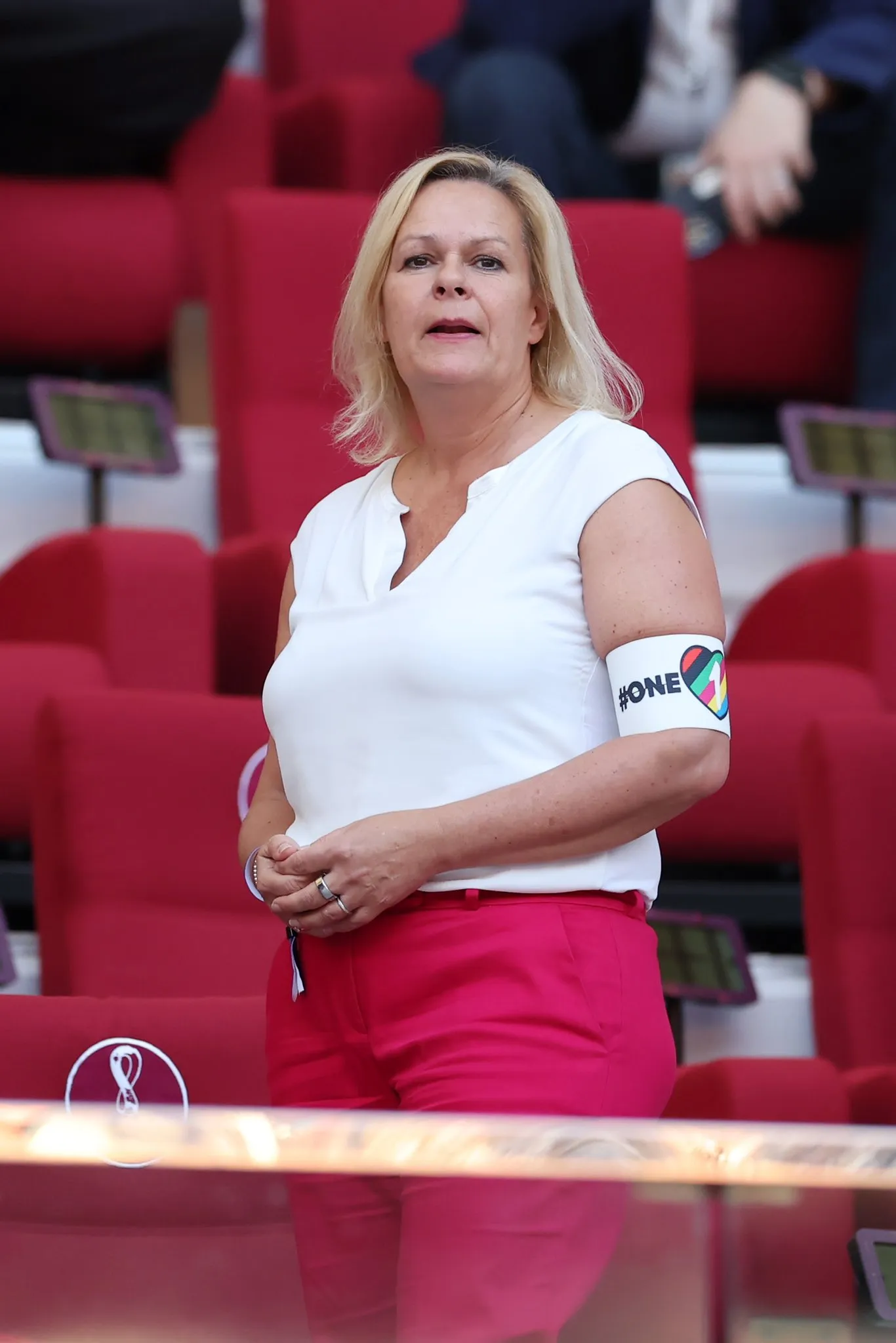И все же повязка "OneLove" на этом матче была. Министр внутренних дел Германии Нэнси Фезер присутствовало на этом матче в вип-ложе рядом с президентом ФИФА Джанни Инфантино. И после приветствия с ним она сняла свой пиджак, под которым на руке у нее и была эта повязка. Так она просидела целый матч. И Инфантино это было явно не по душе.