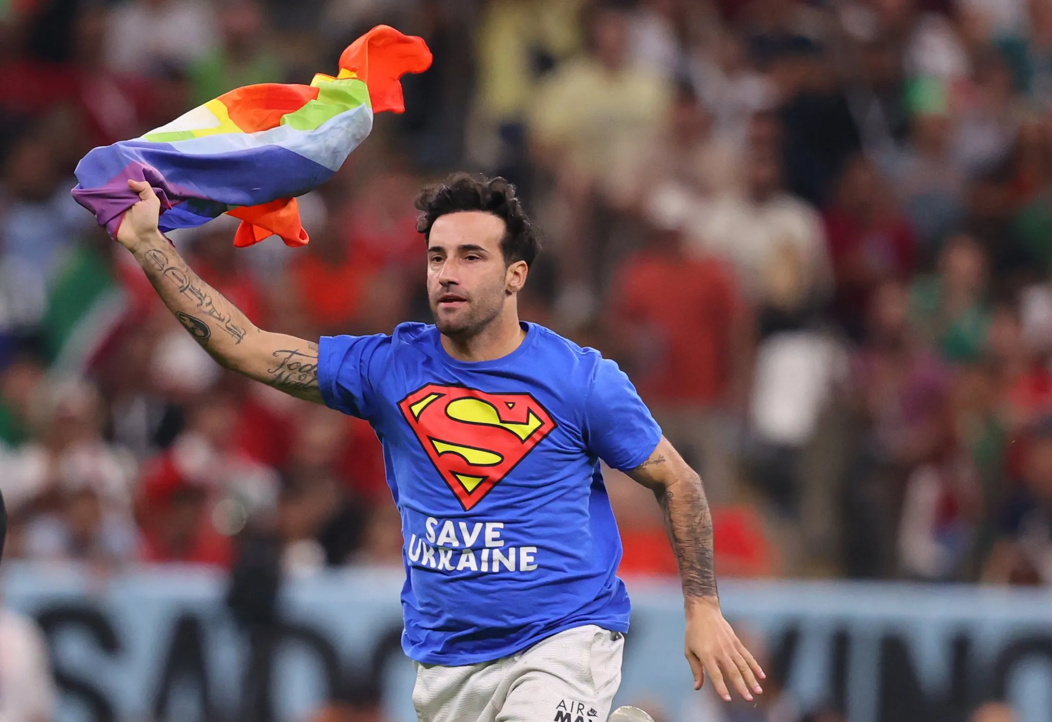 В матче Португалия – Уругвай на поле выбежал итальянец Марио Ферри. Он был в синей футболке с логотипом Супермена, где спереди была надпись Save Ukraine, а на спине – Respect for Iranian women. В руках у него был флаг в радужных цветах. Это могло быть как символ "мира", так и флаг в поддержку ЛГБТ.