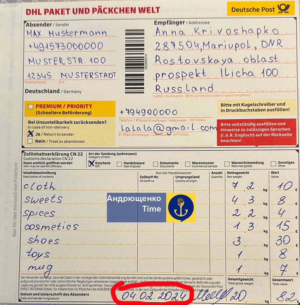 Посылку можно отследить с помощью российской почты, Track24 или почту Донбасса. Андрющенко в сети также опубликовал пример свежего отправления, которое оформили в Германии в Мариуполь 4 февраля 2024 года.