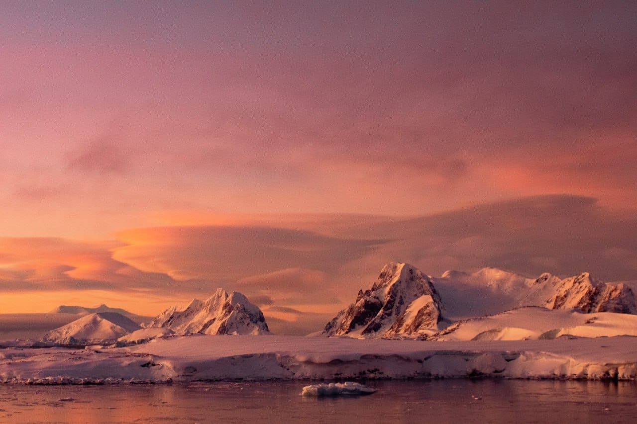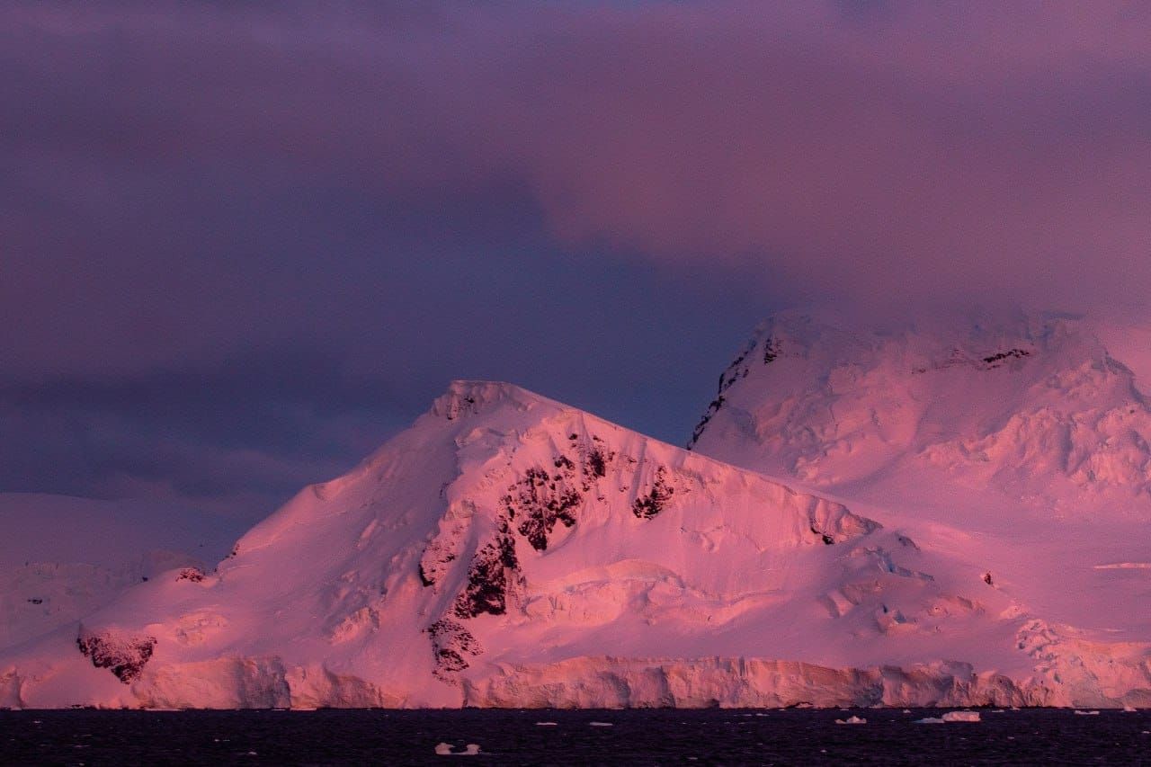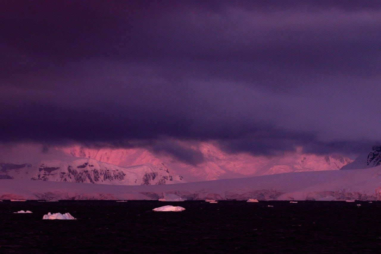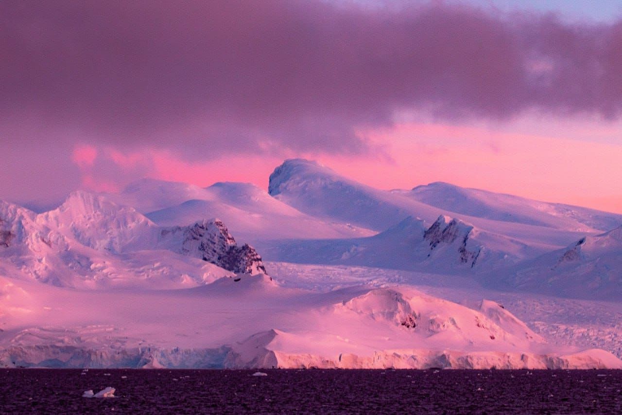 Розовый в Антарктике – это цвет рассветов и закатов, когда небо не затянуто облаками. Очень красиво становится тогда, когда цвета неба отражаются в океане. Весь мир словно полнится розовыми красками.