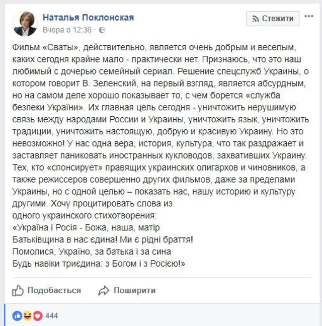 По мнению Поклонской, решение СБУ является абсурдным, и оно показывает, что основной целью Службы безопасности является уничтожение "непорушной связи между народами России и Украины, уничтожить язык, уничтожить традиции, уничтожить настоящую, хорошую и красивую Украину".
